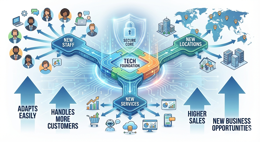 We work with you to create a technology foundation that’s flexible and secure, adapting easily as your company adds new staff, locations, or services. Our team ensures your systems can handle more customers, higher sales, and new business opportunities without missing a beat.
